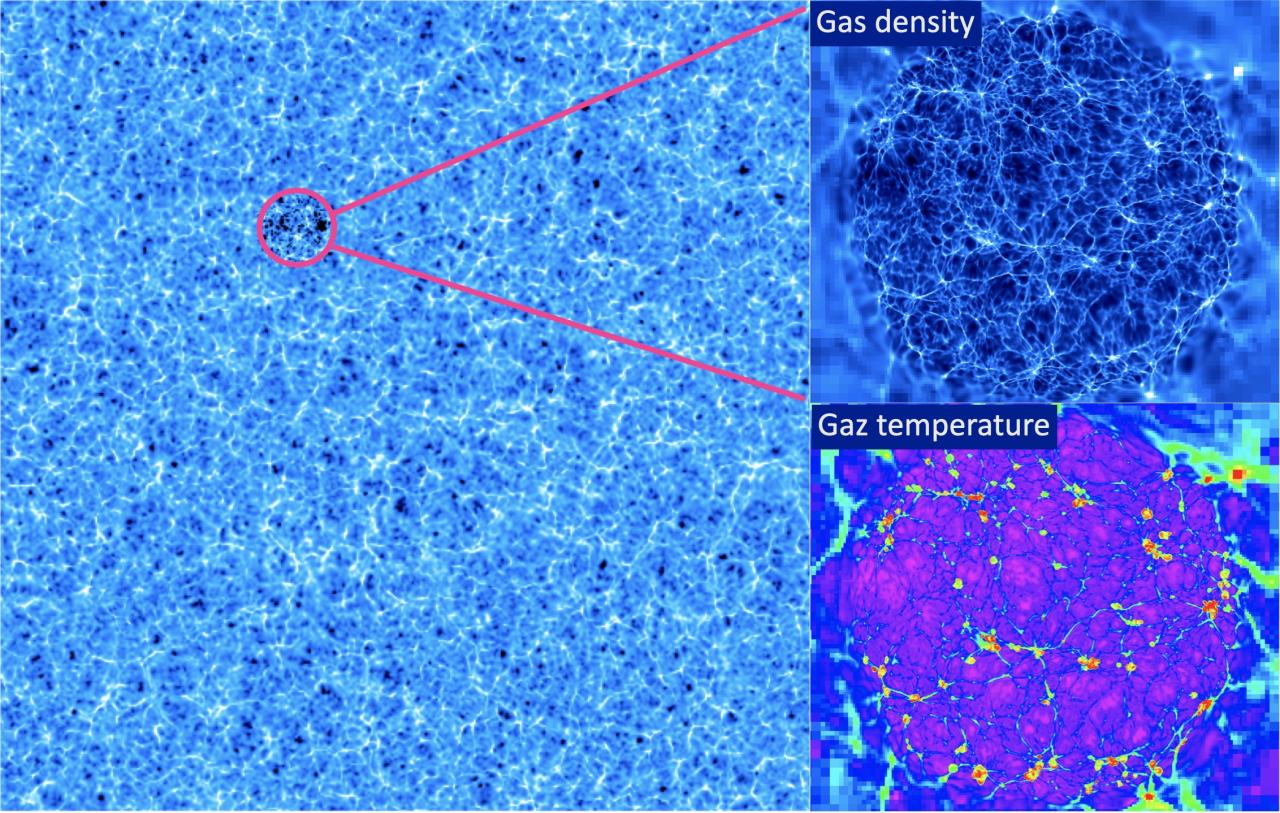 Notre projet consiste à contraindre de manière robuste les effets baryoniques aux échelles et dans les environnements pertinents pour les sondages cosmologiques en réalisant pour la première fois des simulations hydrodynamiques zoomées à l’intérieur de grands volumes cosmologiques. In fine, ces simulations nous permettent une analyse plus précise des grands sondages cosmologiques et permettront de mieux comprendre si les tensions apparentes s’expliquent par la physique des baryons ou remettent en cause le modèle cosmologique actuel, voire, la physique sous-jacente.